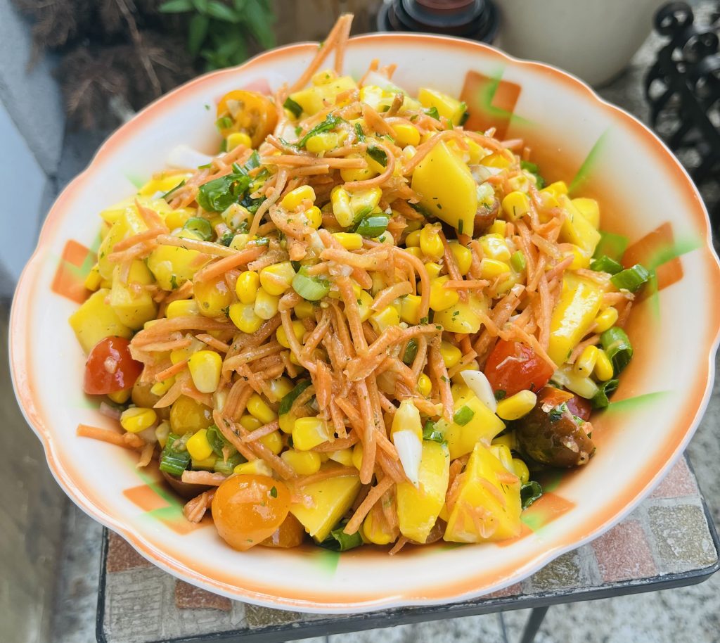 Der Proxianischer verrückter Salat ist nicht so verrückt wie das Dressing. Es handelt sich eigentlich nur ein Senf Honig Dressing, und auf dem kommt es an. Senf Honig Dressing ist ein sehr intensives Dressing, und passt zu fast allen Blatt-, Rohkost- und anderen Gemüsesalaten. Im meinem fall ist das der Verrückte Süß Sauer Salat. Es ist ein ganz einfacher Bunter Salat für den Sommer.
